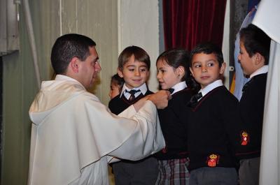 Nuestro Padre Rector, Fray Edgardo Arriagada, dirigió la oración y bendigo las insignias que luego él mismo coloco a los nuevos alumnos del Colegio.