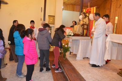 Fue recibida con mucho cariño por niños de Catequesis de Primera Comunión, los cuales depositaron a sus pies flores blancas en señal de su felicidad y cariño por esta hermosa visita.