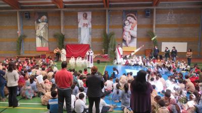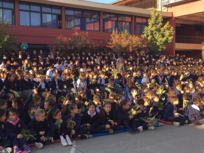 La comunidad educativa del Colegio San Pedro Nolasco se reunió en el patio del establecimiento para recordar el ingreso de Jesús a Jerusalén dando inicio a la Semana Santa.