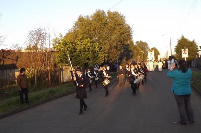 El padre Henríquez, junto a los frailes mercedarios, Rodrigo Aguilar Gómez , Superior de la Comunidad del Sur; Juan Pedro Díaz, que regresa a su misión en Angola, próximamente; al párroco del Sagrado Corazón de Jesús de Traiguén, presbítero Luis Barrientos Riquelme y numerosos acompañantes portando la imagen de María de Mercedes, iniciaron la procesión, desde la Capilla San Ramón Nonato, en calle Bandera, de la Población Club Hípico, tras la oración de envío del rector del plantel institutano.