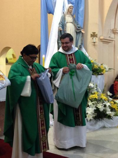 El padre Rodrigo a nombre de la comunidad religiosa y parroquia, le ofreció un hermoso juego de casullas bordadas por las Religiosas Sacramentinas de Chillán, tierra de origen del padre Pedro Juan.