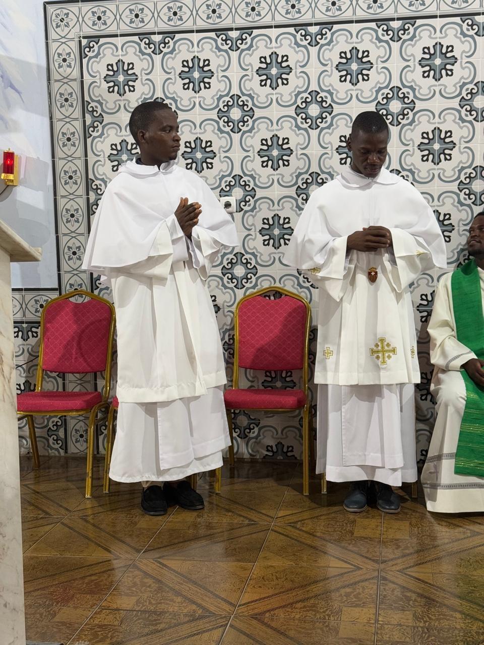 En una emotiva celebración eucarística realizada el miércoles 29 de enero en la Capilla La Merced de Luanda, los hermanos Fr. Joaquim Calete y Fr. José Mbapolo recibieron los ministerios laicales de Lectorado y Acolitado. La Eucaristía fue presidida por el Padre Provincial, Ramón Villagrán, y contó con la presencia de toda la comunidad religiosa mercedaria en Angola, incluyendo postulantes, novicios y estudiantes de Teología.