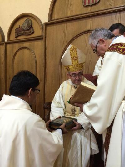 El Padre Morales y el Padre Aguilar presentaron el nuevo párroco ante el Obispo y dieron lectura al decreto correspondiente, para enseguida, fray Díaz Rodríguez, realizar la profesión de fe y luego recibir los símbolos principales de su misión: la Santa Biblia, la Pila Bautismal y los Santos Óleos.