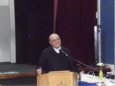 Con un inesperado desayuno profesores, auxiliares, inspectores y personal administrativo se hicieron presente en el auditórium, sorprendieron al padre con un pequeño presente y un emotivo video que repasaba sus años en esta comunidad.