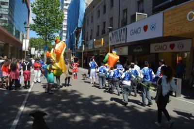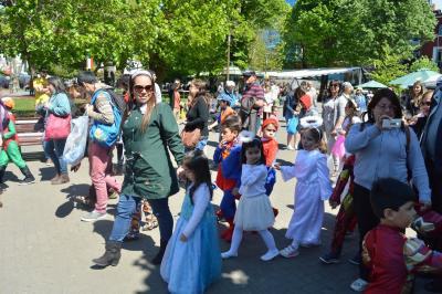 Los pequeños entregaron a los transeúntes marcadores de libros con mensajes del Papa Francisco y de algunos santos, entre ellos San Alberto Hurtado, Santa Teresa de los Andes y San Juan Pablo II. Padres y profesores acompañaron durante el trayecto, compartiendo las canciones y tomando fotografías a los niños disfrazados de animalitos, ángeles, sacerdotes, hadas, payasos y algunos superhéroes.