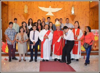 Después de la liturgia de la Palabra, el párroco presentó a Monseñor Carlos Pellegrín, a los jóvenes y adultos que deseaban recibir el Sacramento de la Confirmación. El obispo, comprometió a los jóvenes a acercarse más a la iglesia con este nuevo Sacramento y a los padrinos a guiarlos por el buen camino.