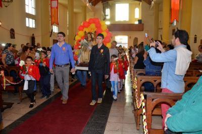 El recibimiento comenzó con la bienvenida a la imagen de los fieles de la parroquia y hermanos en la fe de las diferentes capillas, entrando en nadas llevado por laicos de catequesis adultos y escoltada por niños de catequesis de iniciación a la vida eucarística, quienes la escoltaron hacia el altar cantando y depositando a sus pies una flor blanca en señal de su pureza.