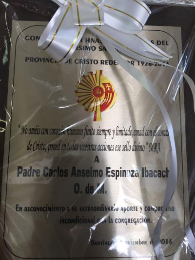 Las Hermanas Mercedarias del Santísimo Sacramento celebraron hace algunos días atrás 90 años de presencia evangelizadora en Chile. En el marco de dicha celebración las hermanas de la Provincia Cristo Redentor (Chile) entregaron un reconocimiento a un religioso mercedario, quien ha sido para ellas un servidor incansable, quien las ha aconsejado e iluminado en su caminar, fray Carlos Anselmo Espinoza O. de M.