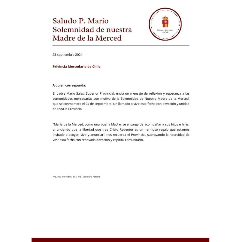 Saludo del p. Mario Salas, O. de M., con motivo de la celebración de nuestra Madre de la Merced